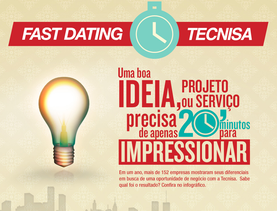 Projeto de rodadas rápidas com empreendedores inovadores, Fast Dating TECNISA, completa um ano e já proporcionou 15 parcerias e 63 ideias estão em avaliação. Gerador de etanol, car sharing nos empreendimentos, sistema de carona entre colaboradores, projetos de drenagem e muito mais. Para manter-se como empresa pioneira no desenvolvimento tecnológico, no uso de mídias digitais e práticas de recursos humanos, a TECNISA lançou um novo modelo de gestão de inovação com fornecedores que integra sua estratégia de open innovation, o Fast Dating. Para manter-se como empresa pioneira no desenvolvimento tecnológico, no uso de mídias digitais e práticas de recursos humanos, a TECNISA lançou um novo modelo de gestão de inovação com fornecedores que integra sua estratégia de open innovation, o Fast Dating. Startups, pequenas, médias e até grandes empresas encontraram as portas da TECNISA abertas para novidades. Os executivos da companhia separam um dia na agenda todos os meses para encontros de 20 minutos com profissionais das mais diversas áreas interessados em mostrar ideias, produtos ou serviços inovadores. Os interessados em participar precisam acessar o endereço www.tecnisa.com.br/fastdating enviar a ideia que gostaria de apresentar à TECNISA. As empresas que conseguirem gerar interesse no primeiro encontro terão um segundo encontro sem tempo determinado, quando poderão detalhar melhor a sugestão oferecida. Confira o infográfico: