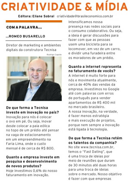 Romeo Busarello é entrevistado pelo Jornal Brasil Econômico sobre as inovações na TECNISA