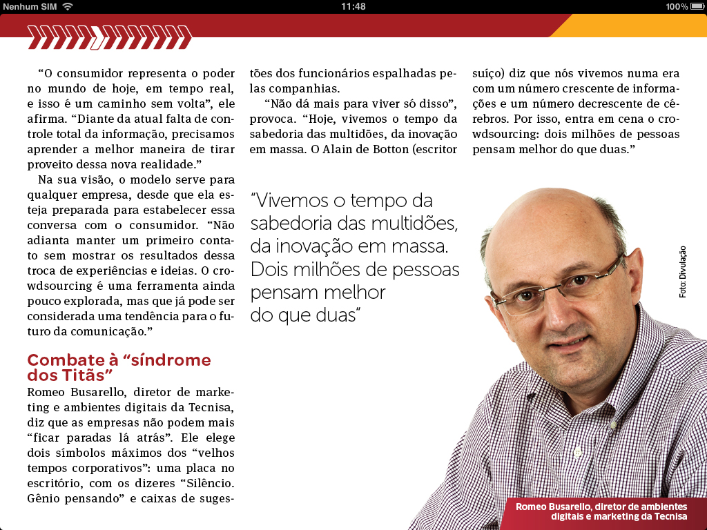 Romeo Busarello, diretor de marketing e ambientes digitais da TECNISA diz que as empresas não podem mais "ficar paradas lá atrás". Ele elege dois símbolos máximos dos velhos tempos corporativos": uma placa no escritório com os dizeres "Silêncio, gênio pensando" e caixas de sugestões dos funcionários espalhadas pelas companhias. Não dá mais para viver disso, provoca, "hoje vivemos o tempo de sabedoria das multidões, da inovação em massa".